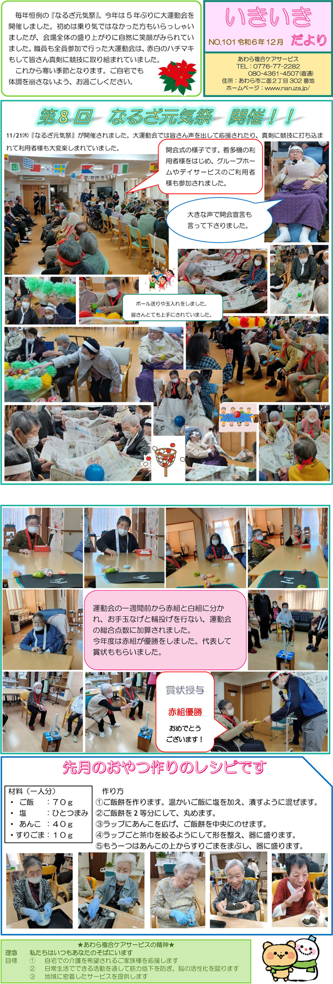 あわら複合ケアサービススタッフ手づくりの月1回発行「いきいきだより」。