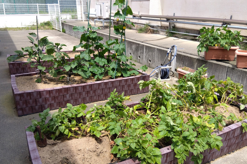 中庭に小さな畑があり、自分たちで育てた野菜を調理し食事で食べています。