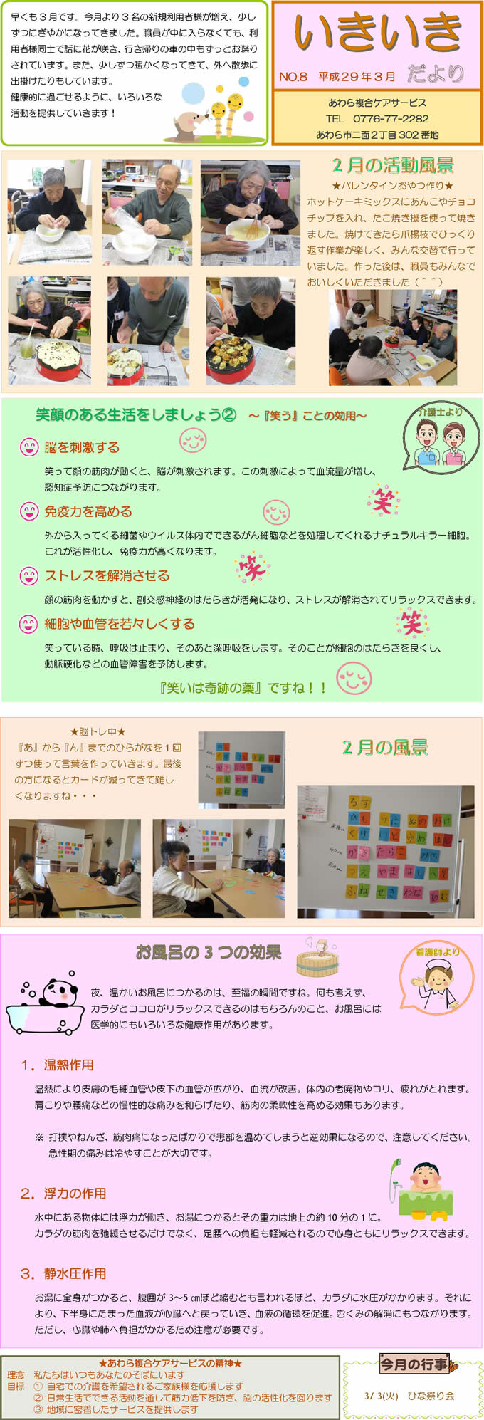 あわら複合ケアサービススタッフ手づくりの月1回発行「いきいきだより」。
