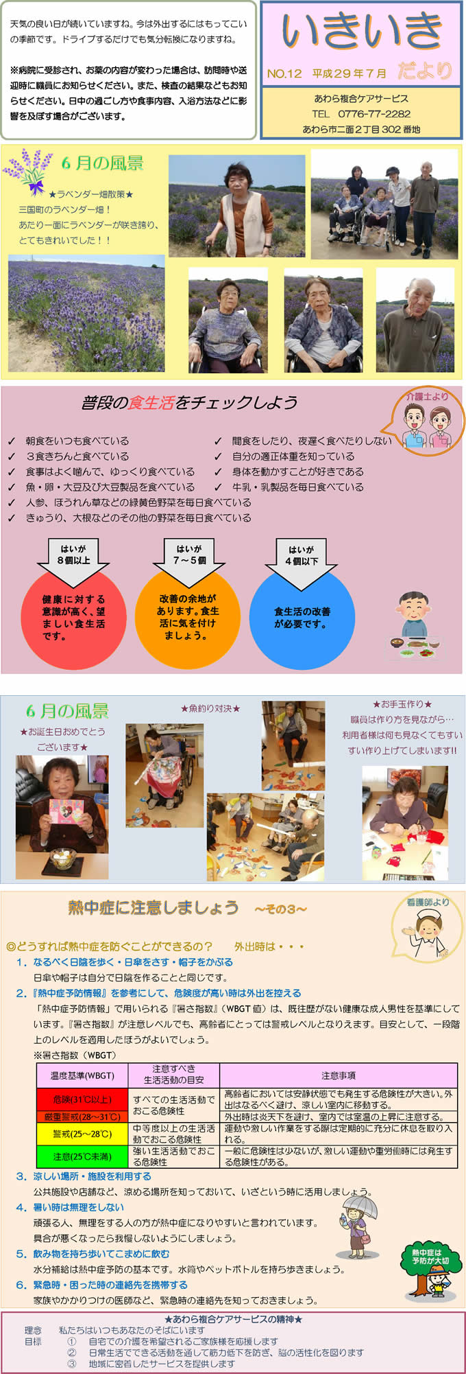 あわら複合ケアサービススタッフ手づくりの月1回発行「いきいきだより」。