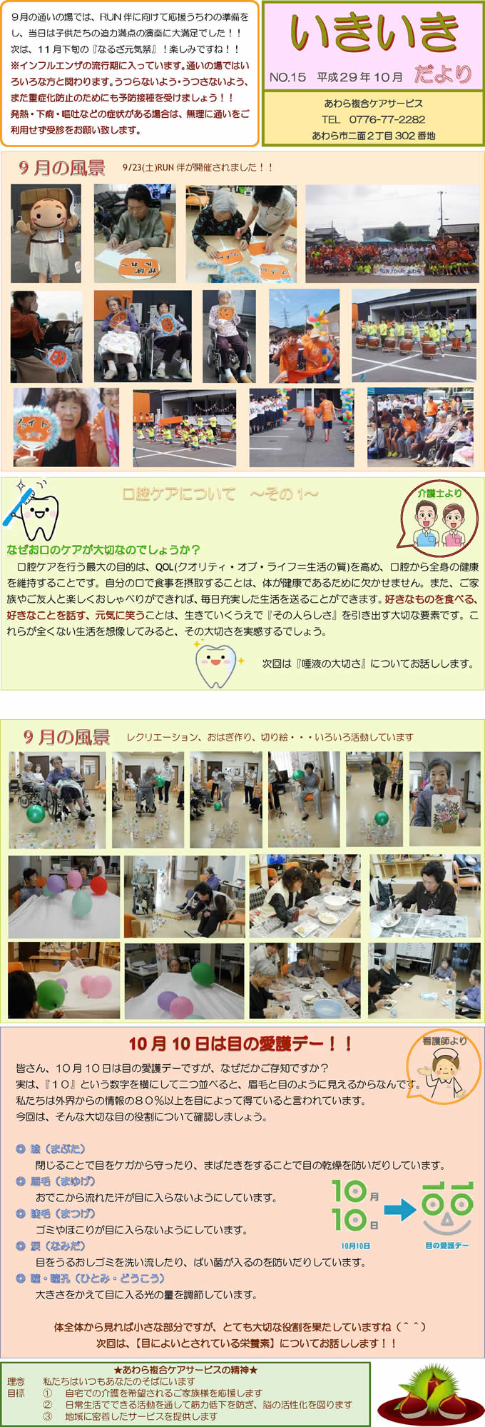 あわら複合ケアサービススタッフ手づくりの月1回発行「いきいきだより」。