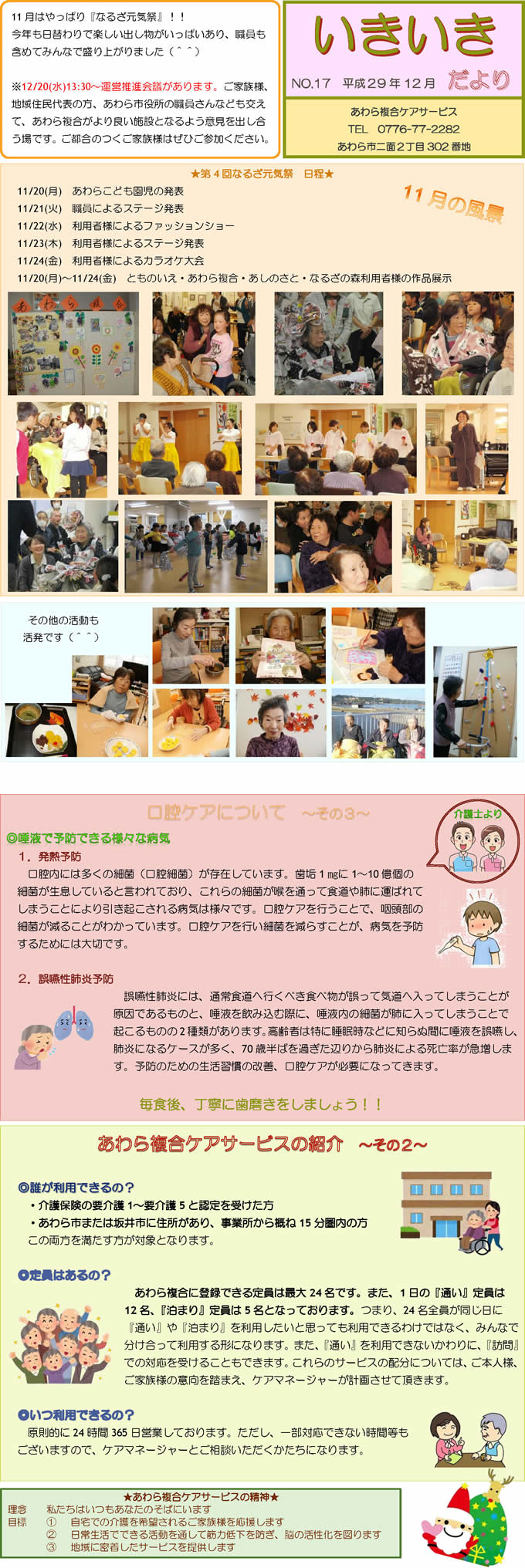 あわら複合ケアサービススタッフ手づくりの月1回発行「いきいきだより」。