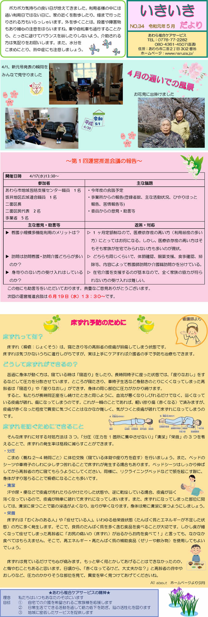 あわら複合ケアサービススタッフ手づくりの月1回発行「いきいきだより」。