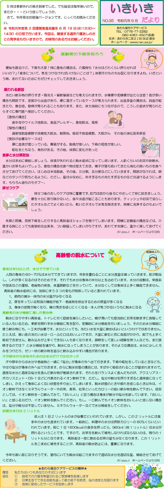 あわら複合ケアサービススタッフ手づくりの月1回発行「いきいきだより」。