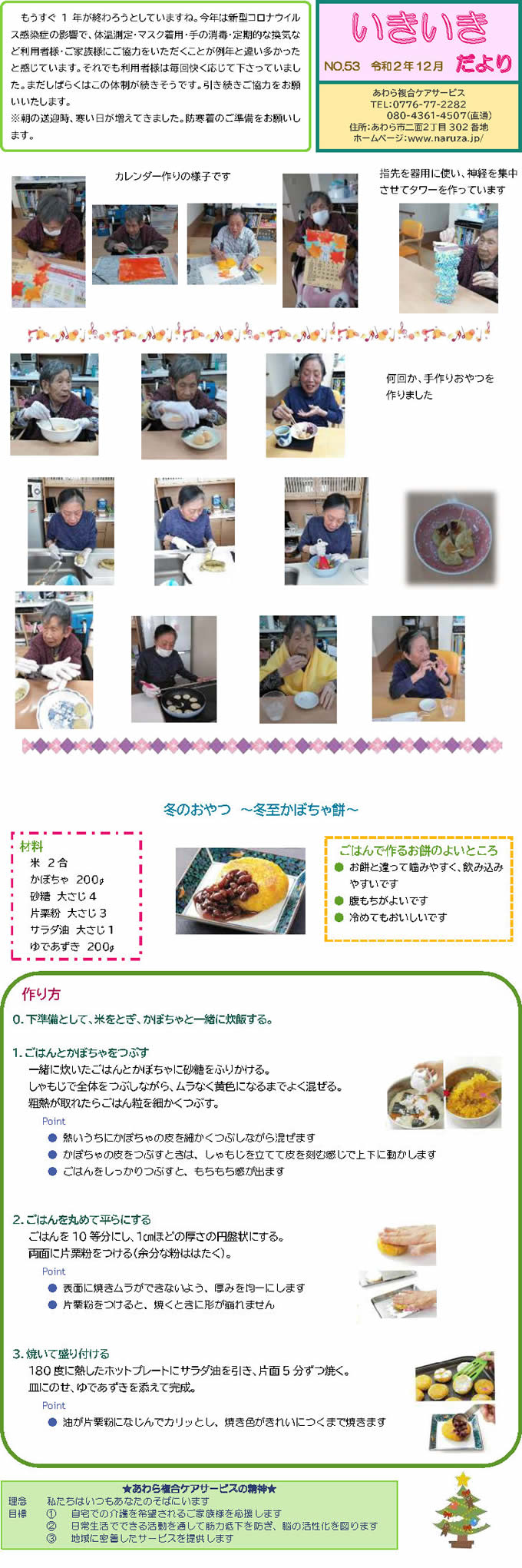 あわら複合ケアサービススタッフ手づくりの月1回発行「いきいきだより」。