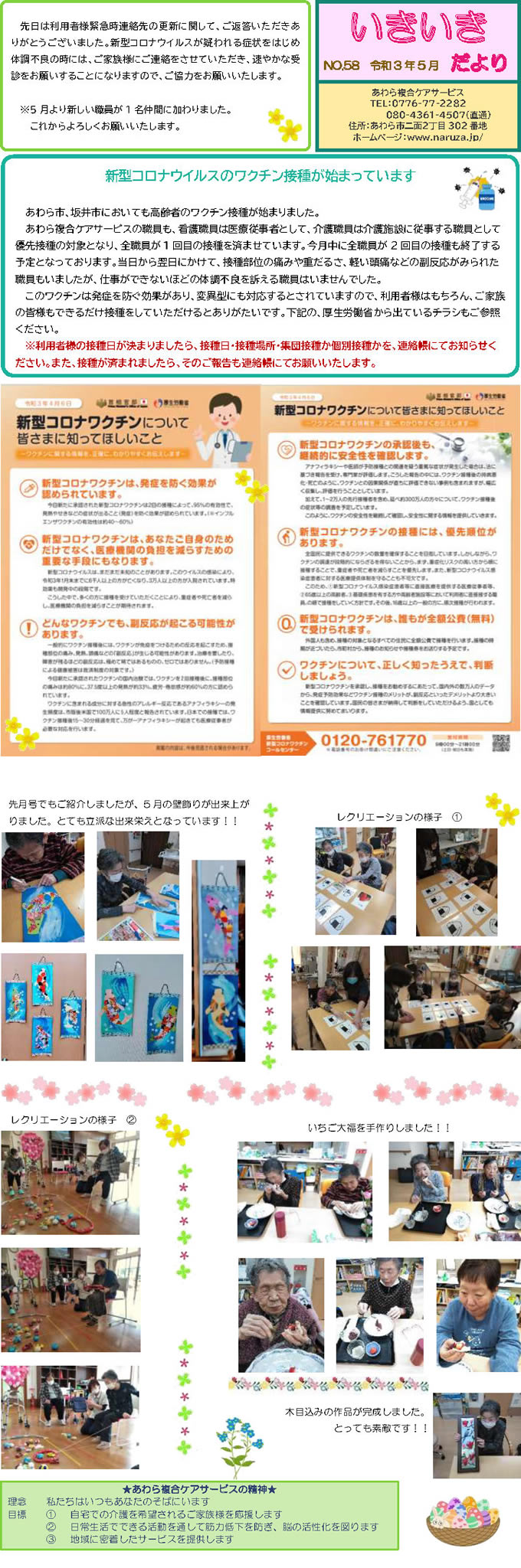 あわら複合ケアサービススタッフ手づくりの月1回発行「いきいきだより」。