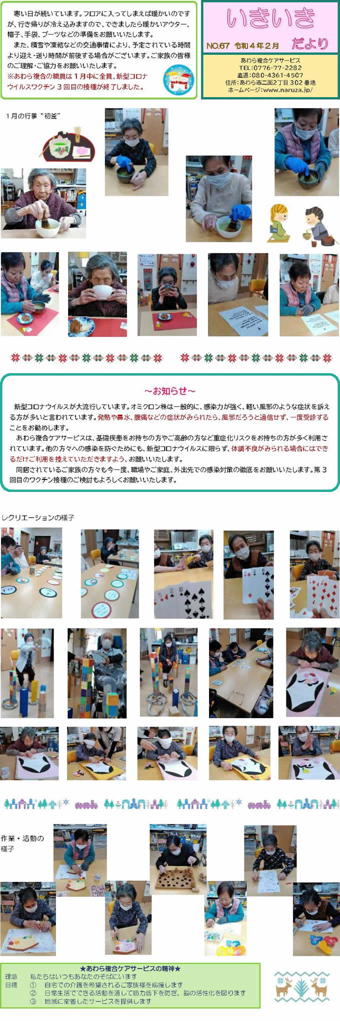 あわら複合ケアサービススタッフ手づくりの月1回発行「いきいきだより」。