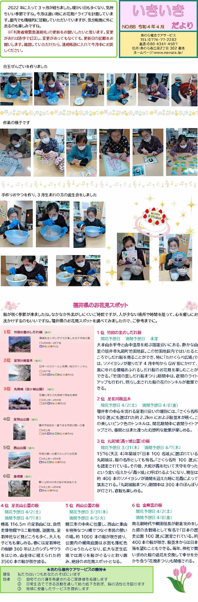 あわら複合ケアサービススタッフ手づくりの月1回発行「いきいきだより」。