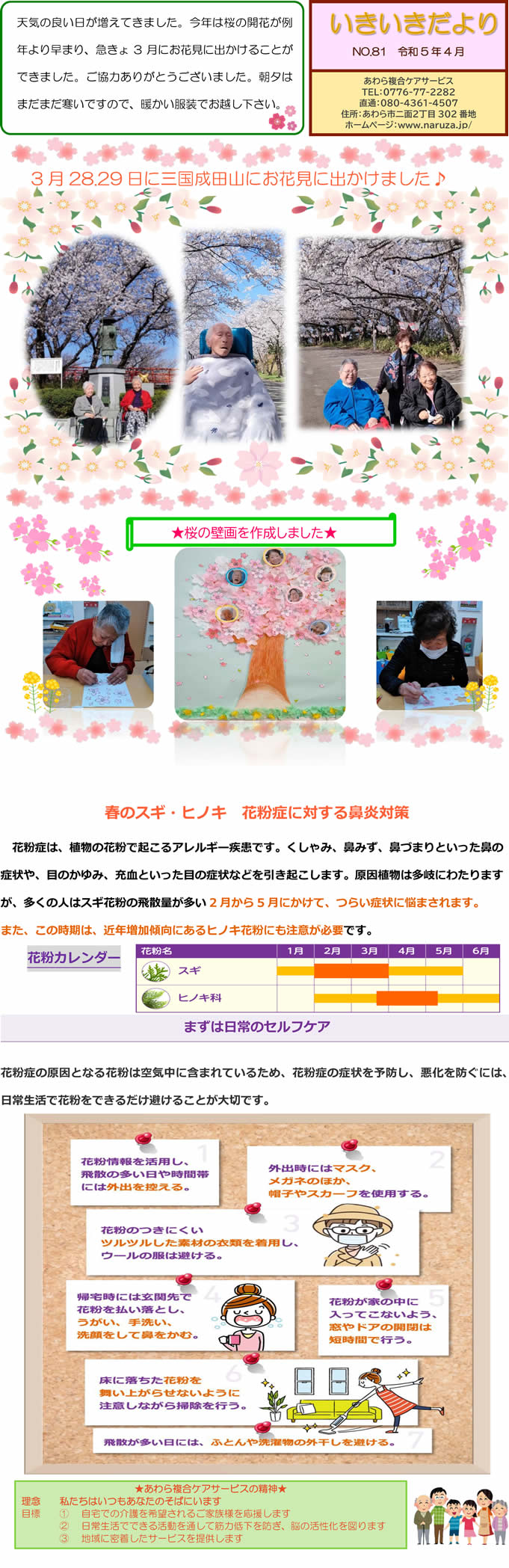 あわら複合ケアサービススタッフ手づくりの月1回発行「いきいきだより」。