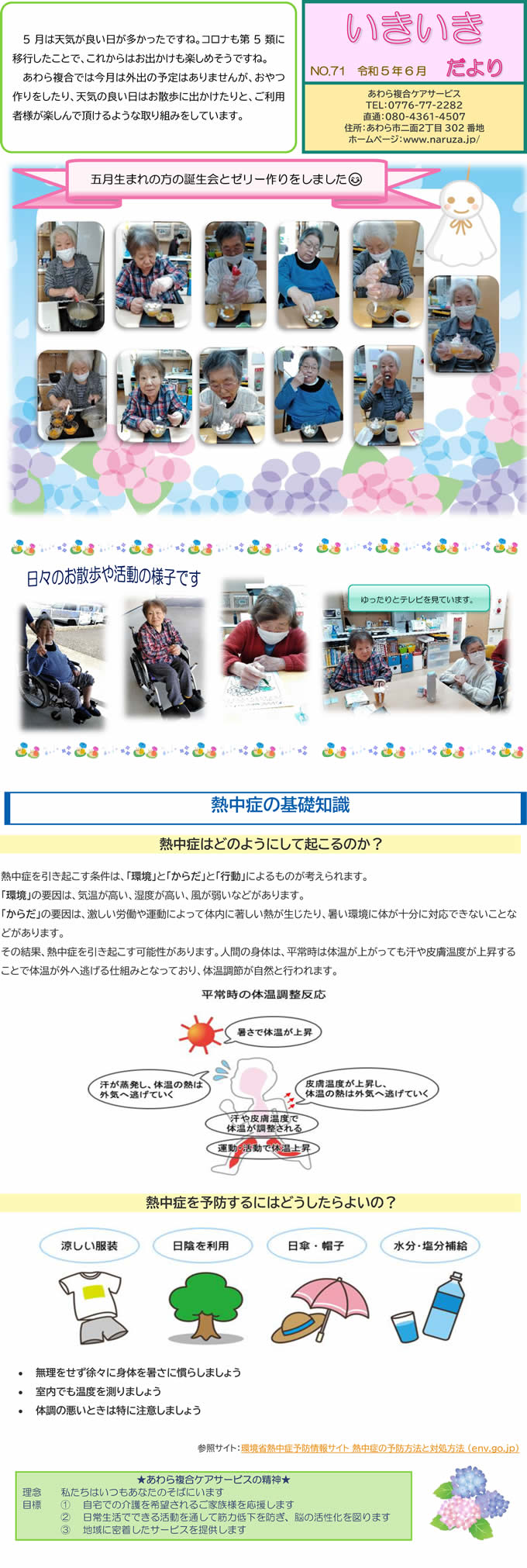 あわら複合ケアサービススタッフ手づくりの月1回発行「いきいきだより」。