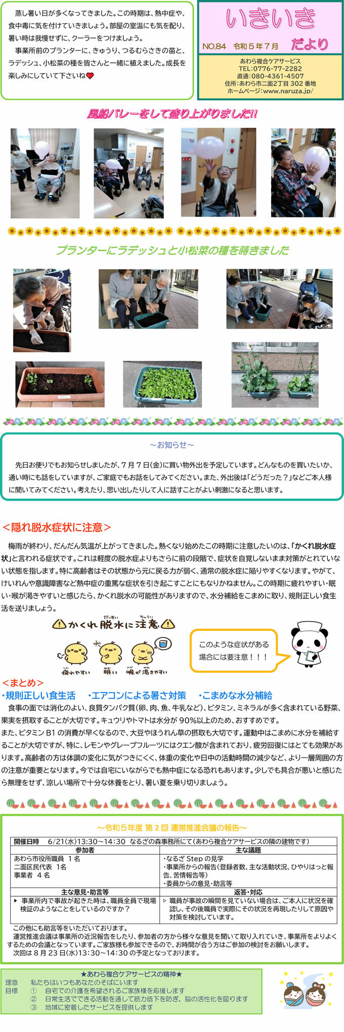 あわら複合ケアサービススタッフ手づくりの月1回発行「いきいきだより」。