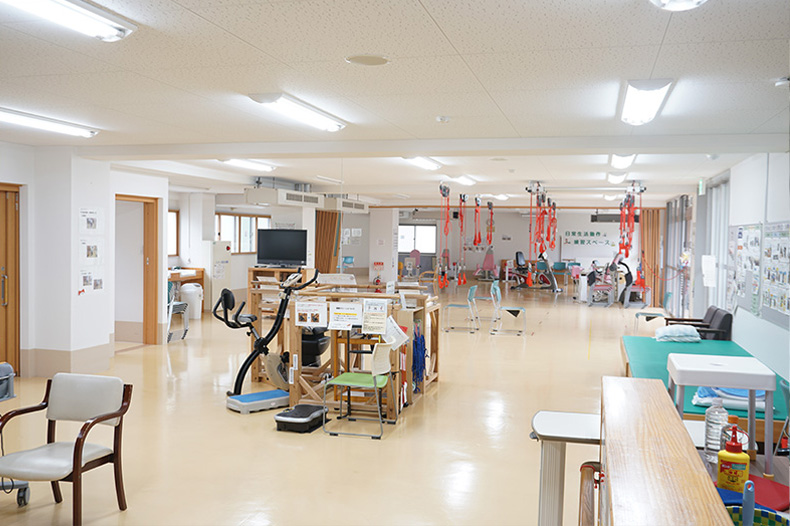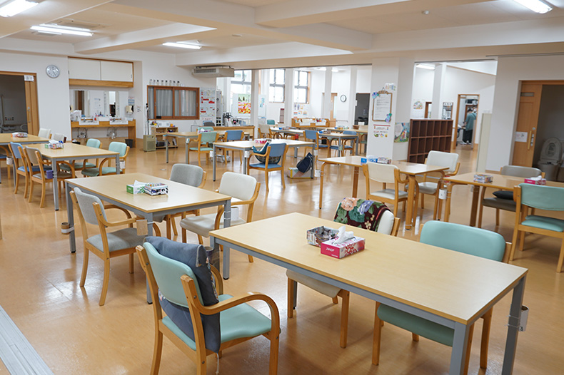 広い利用者スペース1100㎡(333坪)を活かし、プログラムごとに、活動エリア、居場所を分けることで、利用者自身の主体的な選択や1日の行動の変化を促します。移動距離も利用者の能力に応じた距離を引き出しています。